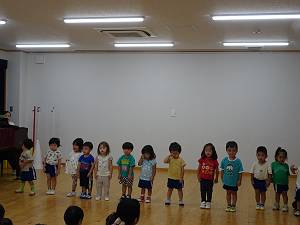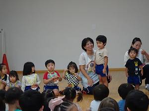 | 令和7年9月29日(月) お誕生会 全園児 遊戯室で、9月生まれのお友達のお誕生日会を開きました。 お誕生日当日に、クラスのお友達からおめでとうの歌と、園からのプレゼントを渡しているのですが、月に一度、全園児の前で、「何歳になりましたか?」「好きな食べ物は何ですか?」等、月当番の職員から、幾つかインタビューを受け、応える機会を設けています。回を重ねるごとにしっかり発表できるようになっています。 その後、クラスごとにお歌の発表があり、職員の出し物を見ます。背筋が伸び、とても真剣な表情です。 |