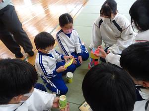 | 11月18日(木) 志方中学校3年瀬戸の交流会 もも組 大きい!が第一印象でした。やっと実現した中学生との交流会。小グループに分かれ、3年生が夏休み期間に家庭科の宿題で製作された玩具や絵本を、使い方を教えてもらいながら遊ばせてもらって、楽しい時間を過ごす事が出来ました。 最後に中学生から合唱コンクールで発表した曲の生歌を聞かせていただきました。澄んだ歌声とハーモニーの美しさに聞き入り、うっとりとするもも組のお友達でした。 |