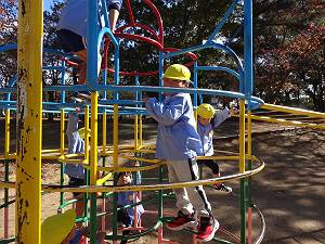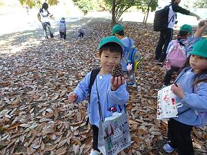 11月19日(木) 遠足 全園児 まっしろ、しろ、あか組は、普段の散歩で歩く道のりを少しだけ延伸させて歩いたのち、園庭で遊び、お家の方に作って頂いたお弁当を頂きました。 き、みどり、もも組は、日岡山公園に行き、園周辺では収集できない大きなまつぼっくりや、赤く色づいたポプラの葉、大きくて丸いドングリなどを目を輝かせて拾い、製作時間に作った収集バックいっぱいに詰め込んでいました。 また、日岡山公園にあるロング滑り台に挑戦したり、ジャングルジムやシーソー等、珍しい遊具に次々に挑戦していました。お昼に、お家の方に作ってもらったお弁当を見せ合いながら、会話も弾み、普段以上に楽しい昼食時間となりました。 |