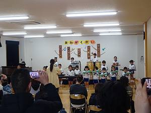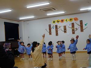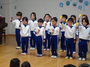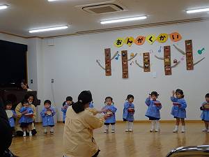 12月5日(金) 音楽会 全園児 保護者の方にお越しいただいて音楽会を開催し、0歳児から5歳児まで全園児が演奏を披露しました。 音遊び・リズム遊びは、4月当初からお誕生日会の度に発表してきました。しかし、保護者の方に見ていただくのが初めてでしたので、0歳児・1歳児がどう行動するかが不安でした。そんな不安も吹き飛ぶしっかりした演奏が出来ました。そして、年齢ごとの成長を観ていただけた事に安堵しました。沢山の拍手を送って下さったことに感謝申し上げます。 1歳児 2歳児 3歳児 4歳児 5歳児 |