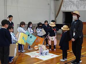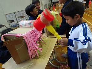 | 12月17日(水) 東っこチャレンジ(志方東小学校との交流会) もも組(5歳児) 志方東小学校のお祭りにご招待いただき、5歳児が参加してきました。 スタンプラリー形式で、1年生ブースから6年生ブ--スまで回りやすい工夫がされていました。小学生の各学年がテーマに沿った催しを展開し、子ども達は、各ブースでお兄さんお姉さんに遊び方を教えてもらいながら思いっきり楽しみ、スタンプを押してもらって充実感に満たされていました。 サインコーナーでは、園児にとっては謎の人(学校で人気者の先生⁈)からサインをもらう場面もありました。 モグラたたきに挑戦 サファリバスに乗って サインコ-ナー |