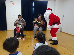 12月24日(金) お誕生日会&クリスマス会 全園児+すくすく広場 お誕生日会とクリスマス会を遊戯室にて行いました。 お誕生日会にちなんで、「だ~れだ!」クイズがあり、職員の幼少のころの写真を大きく引伸ばし、どの先生の写真なのかを当てるゲームが盛り上がっていました。 クリスマス会では5歳児によるベル演奏から始まって、全園児による合奏。サンタさん登場、キャンドルサービスと盛りだくさんで、大笑いする場面も、静かにお話を聞く場面もあり、とても楽しい会になりました。 「だ~れだ」 5歳児によるベル演奏 全園児で合奏 サンタさん登場 キャンドルサービス |
