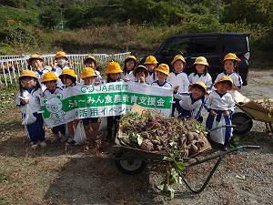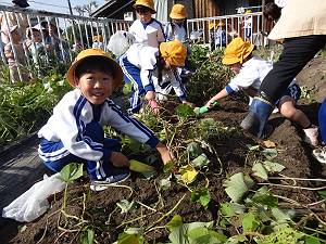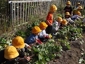 11月7日(金) 芋ほり き、みどり、もも組 園の畑で、6月に植え付けたサツマイモを収穫しました。 今年は土が柔らかく、掘りやすそうだったのですが、蔓を取り除き、いざ掘るとなると、お芋が地中深くに潜っているものが多く、大苦戦。それでも子ども達は諦めることなく掘り進め、収穫できた笑みは最高に輝いていました。 収穫後、5歳児は芋蔓を佃煮にするお手伝いで、蔓の皮むきに挑戦したり、自分で収穫したお芋の重さを量り、数字化して比較し、多くの発見をすることが出来ていました。 |