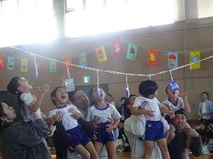 令和7年度運動会 全園児 少し肌寒さを感じる23日(木)、志方体育館をお借りして、運動会を行いました。 0歳児のお友達は、初めての環境に戸惑い泣く姿もありましたが、競技が始まると、どのクラスもやる気に満ちていました。 平日の開催にもかかわらず、たくさんの保護者の方に参加いただき、たくさんの拍手や笑顔を園児に贈って下さりありがとうございました。 ・もうすぐ始まる ・たくさんのお客さん ・0歳児かけっこ ・感動の5歳児リレー・一生懸命!2歳児競技 ・ばっちり決めたぜ組体操 |
